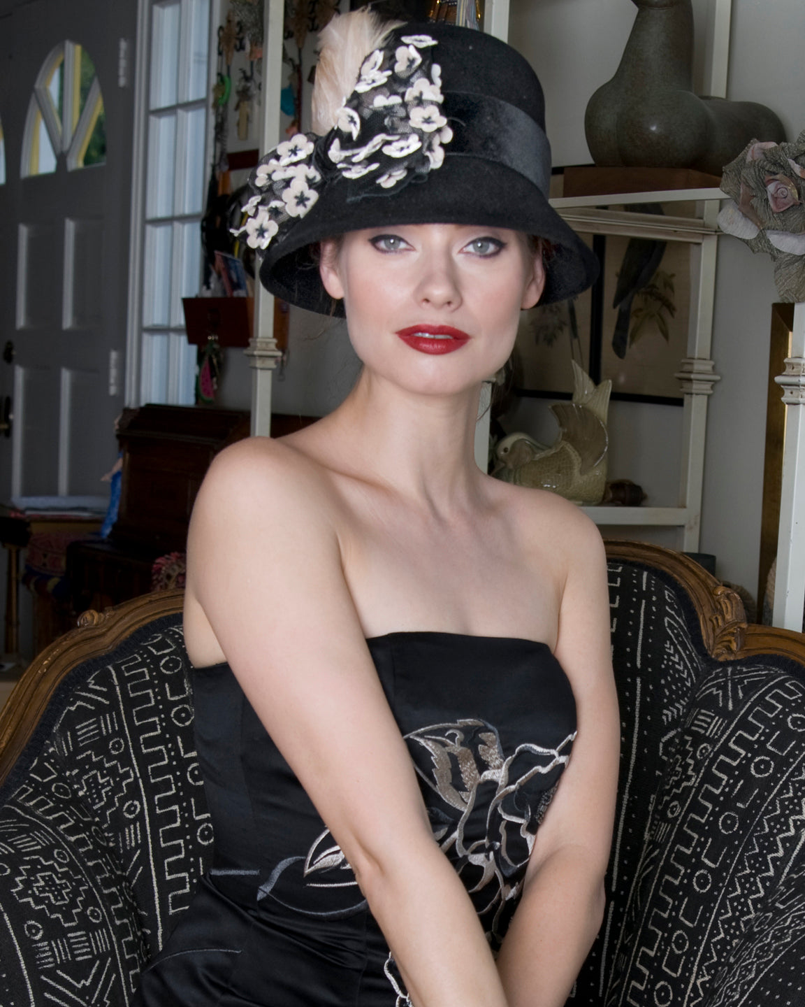 Profusion of tiny silk velvet flowers on tulle & feather pad, velvet band & loop