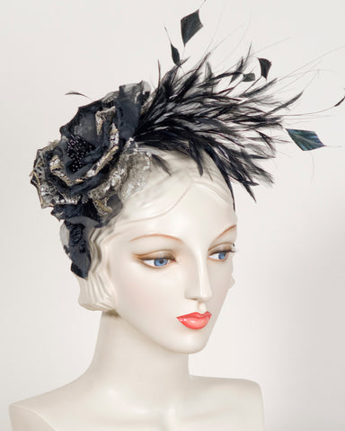 Metallic lace & cut silk velvet cabbage rose & feather spray on velvet covered headband