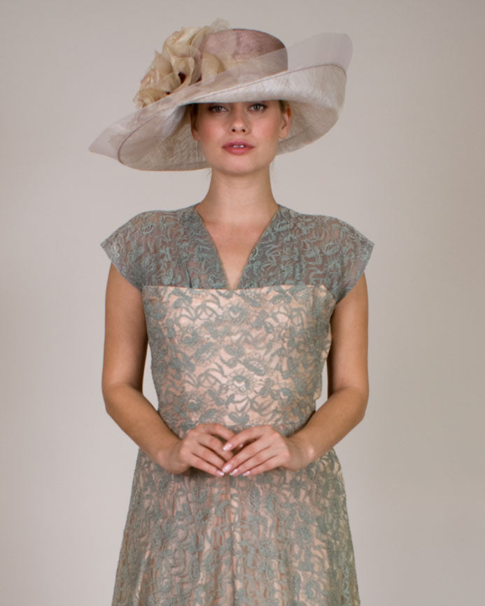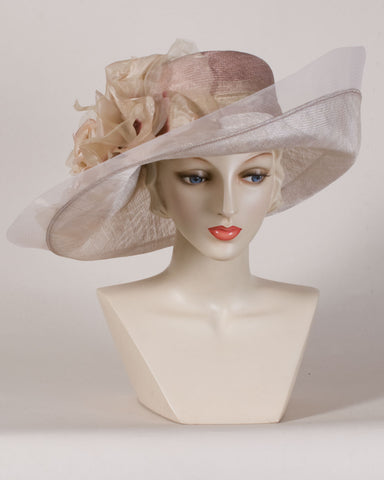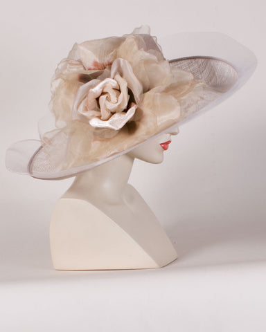 Sisal crown & sinamay brim with giant chiffon rose & horsehair edge
