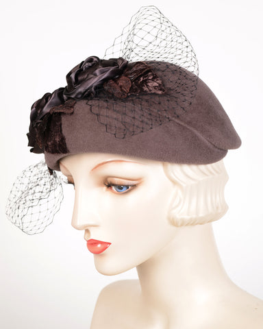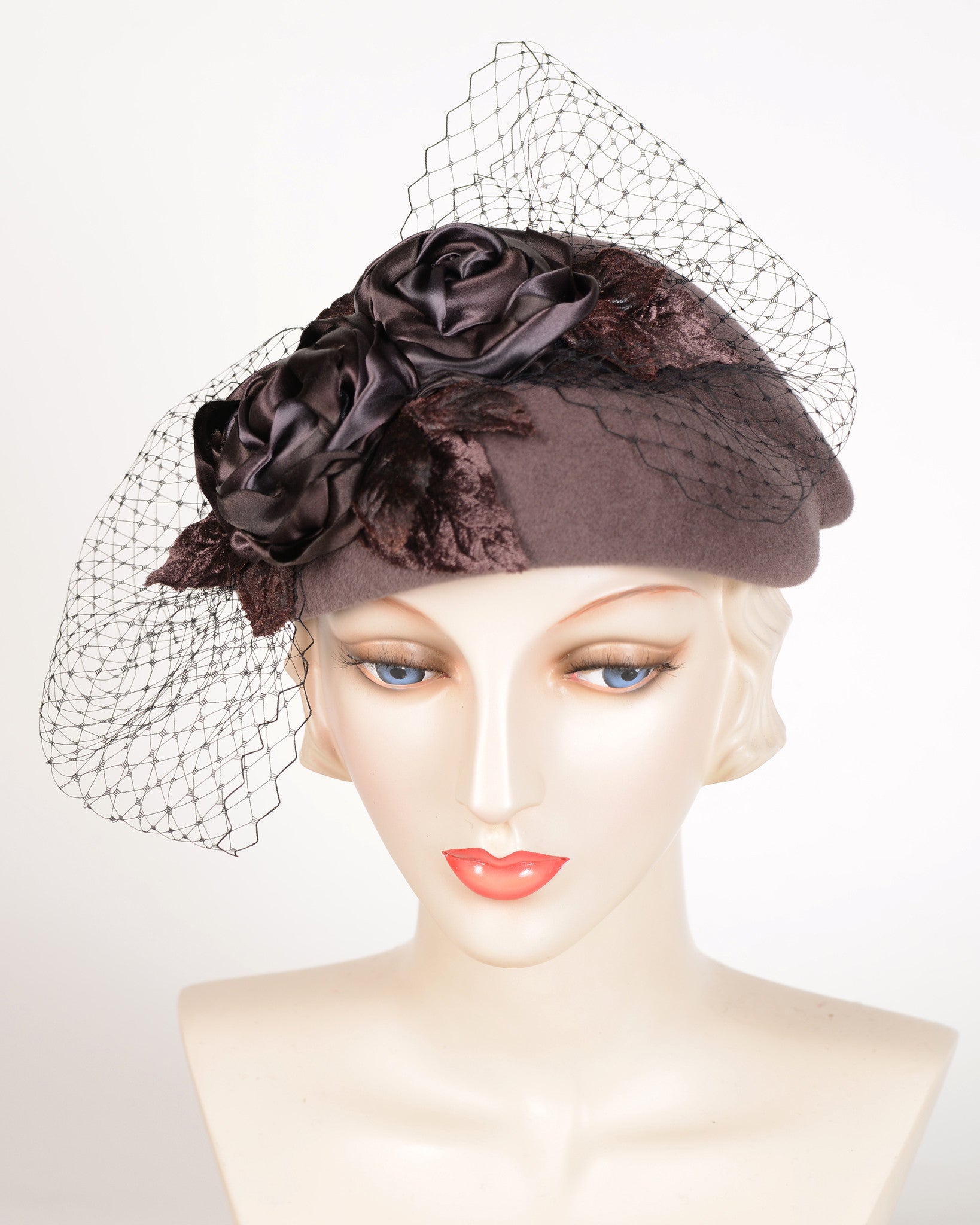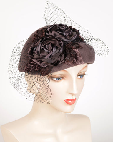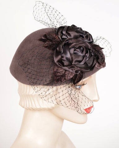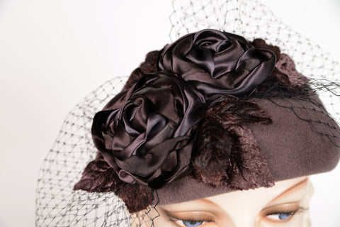 Hand dyed ribbon roses, velvet leaves & veiling