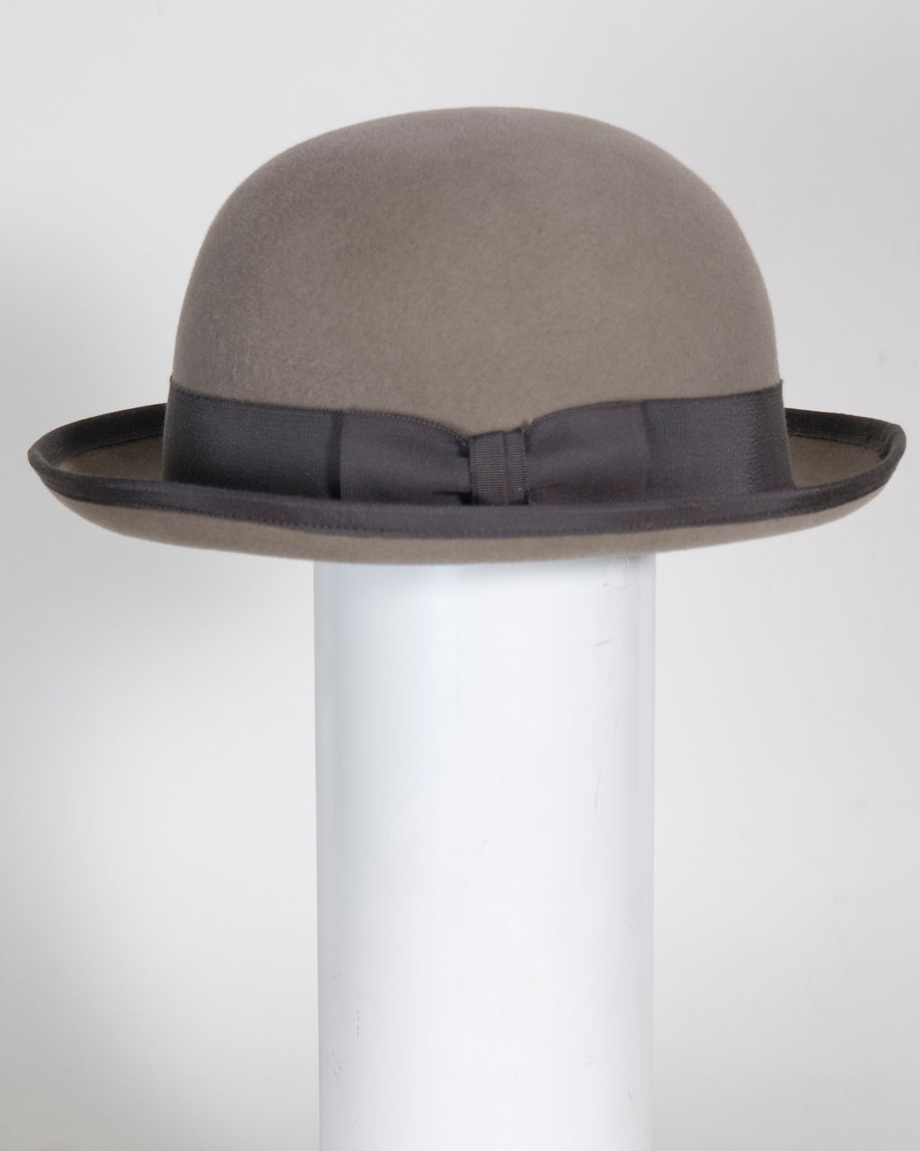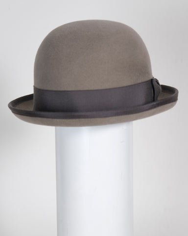 F0386 Bowler, sueded finish felt, taupe w/brown, 2" brim, Headsize 23 1/8"