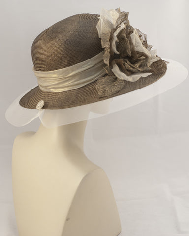 Sisal straw hat with large handmade cabbage rose of mixed fabrics, horsehair edge