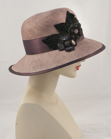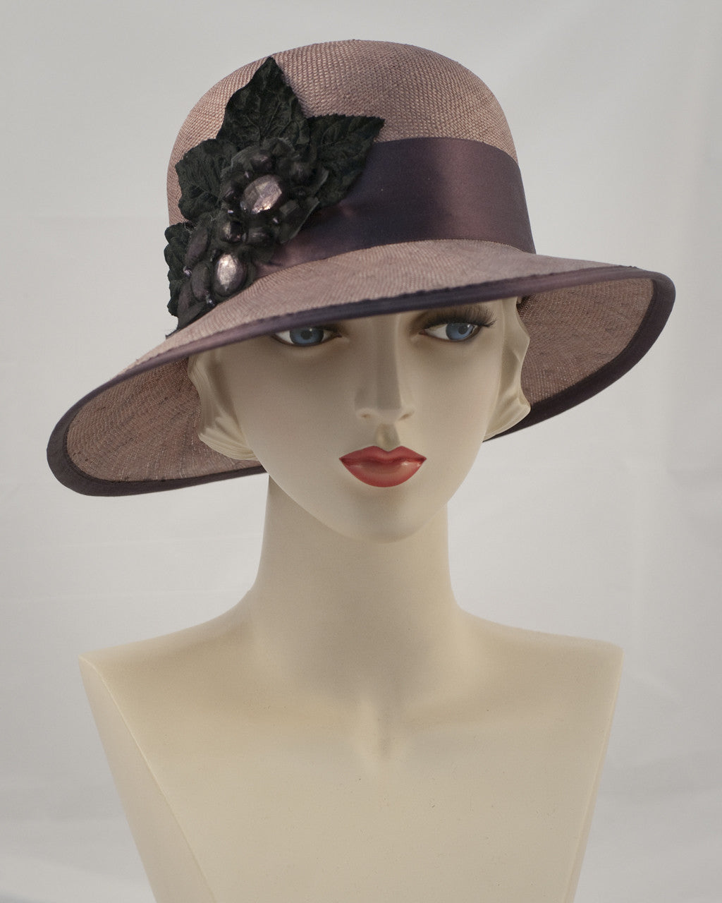 Sisal hat with stone & chiffon applique, silk velvet leaves & silk satin ribbon
