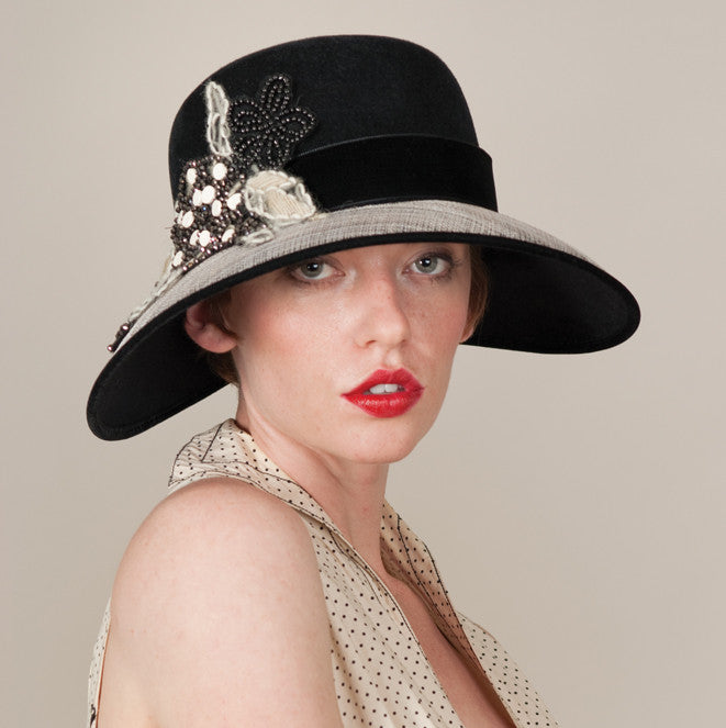 6276HLVS Helena, black with natural/silver sinamay over velour