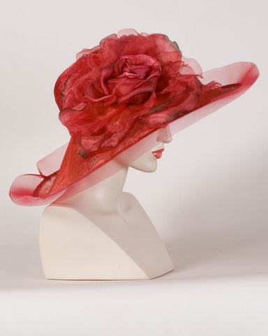 Sisal crown & sinamay brim with giant chiffon rose & horsehair edge