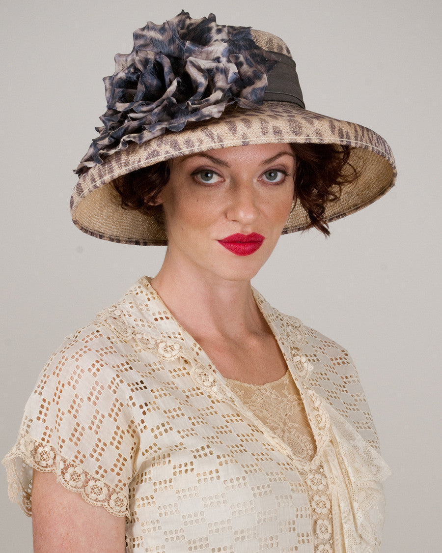 Audrey, natural/cheetah, sisal hat with sinamay overlay & silk cabbage rose