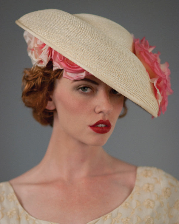 Dorothy, corn with pink, Milan braid hat with silk roses