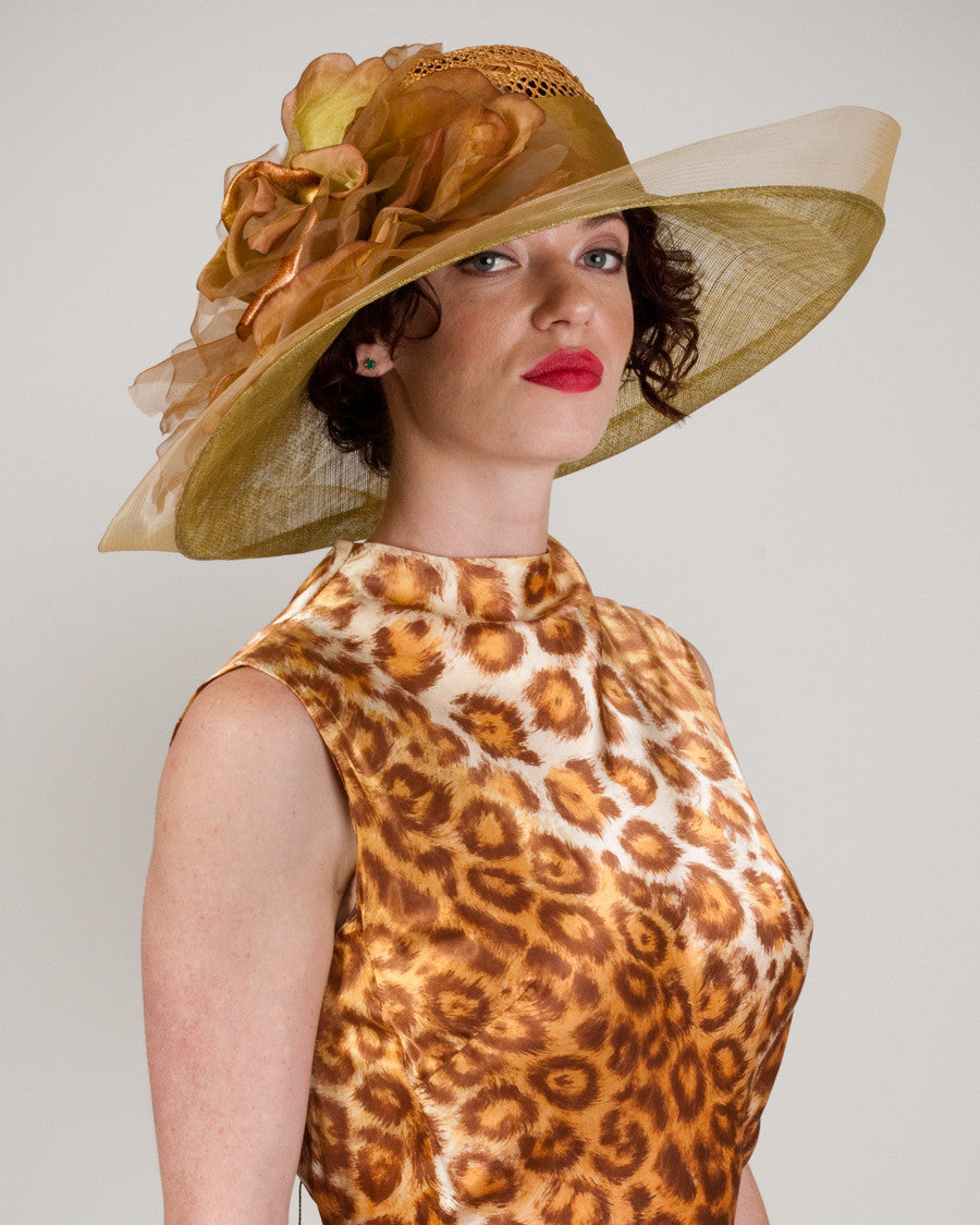 Grace, toast/pistachio, lacy sisal crown & sinamay brim hat, giant silk cabbage rose & horsehair edge