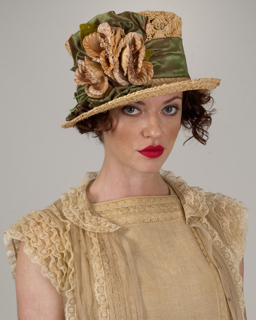 Top Hat, tea with olive, crochet raffia hat with taffeta ribbon & vintage flowers