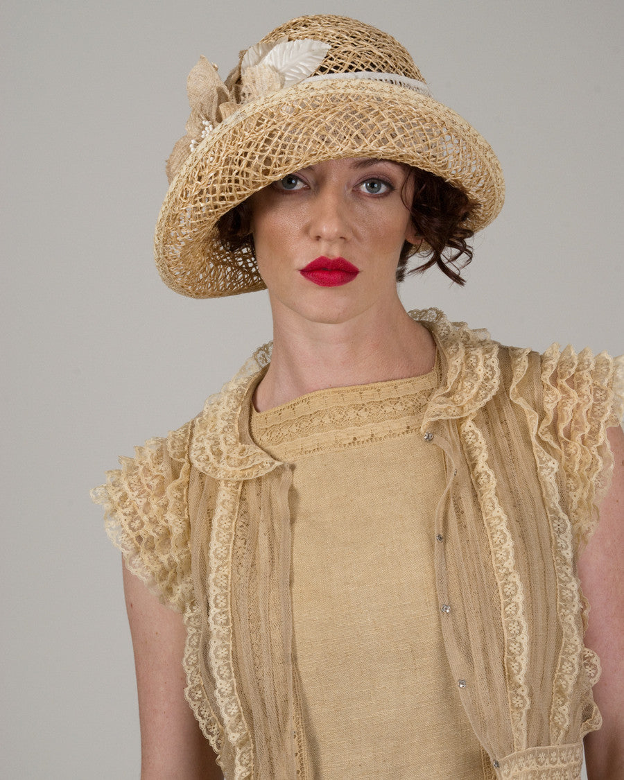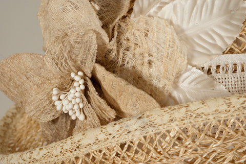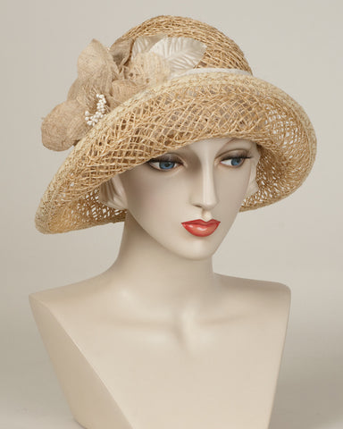 Cloche, tea, lacy jute hat with handmade paper flowers