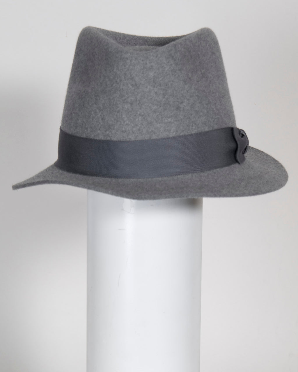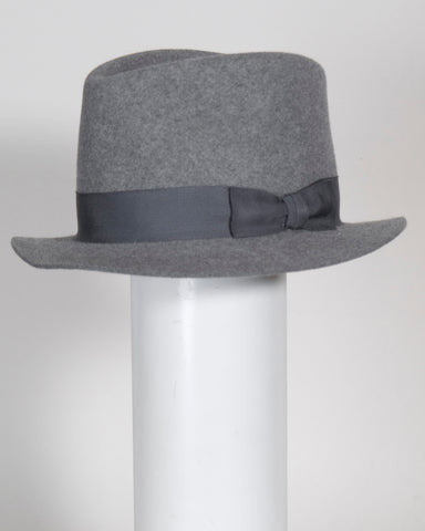 F0381 Tall fedora, 5 1/2" crown ht, grey tweed wool felt, 1 3/4" brim, Headsize 22"