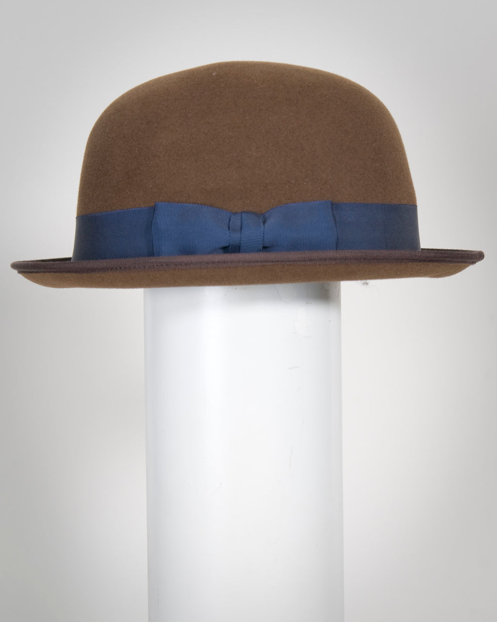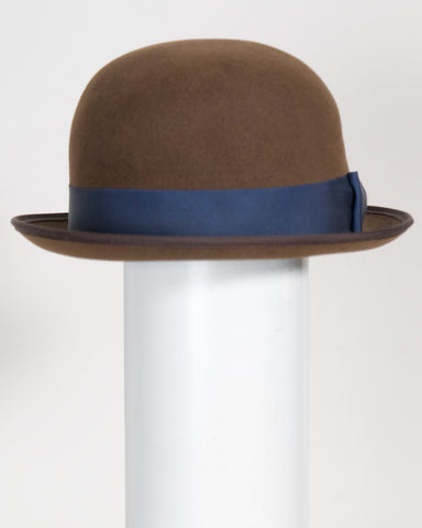 F0390 Bowler, suded finish felt, brandy with navy, 1 1/2" brim, Headsize 22 3/4"