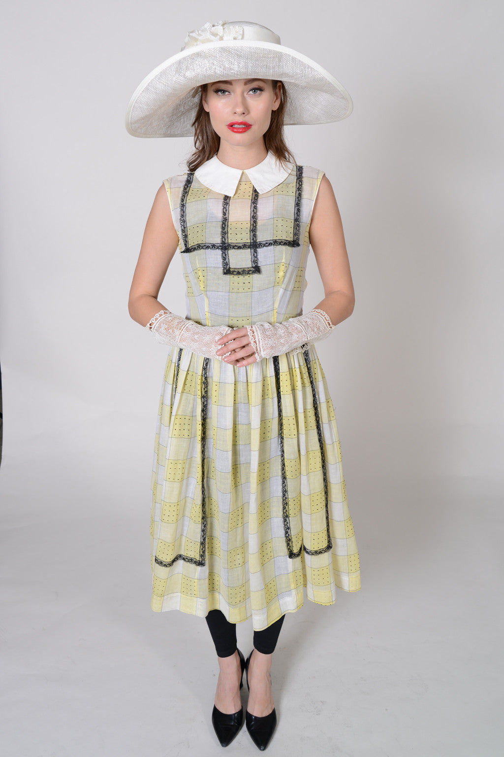 Lemon and white plaid cotton organza dress with black lace trim. Length 44 1/2", shoulder to waist 16 1/2", bust 36", waist 28". Great vintage condition.