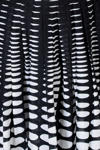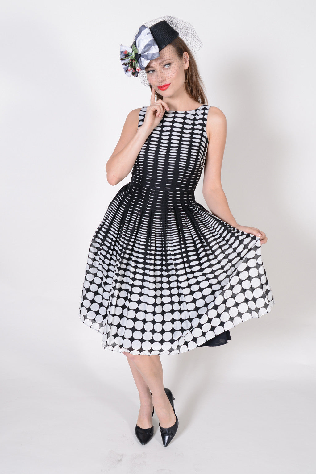 Black & white oval dot full skirted dress, fully lined, cotton. Length 39 1/2", shoulder to waist 15", bust 35", waist 28". Great condition